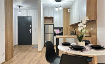 Salon połączony jest z aneksem kuchennym, dzięki czemu powstała funkcjonalna i otwarta przestrzeń dzienna. Kuchnia została wyposażona w sprzęty AGD w tym lodówkę, zmywarkę, płytę grzewczą oraz piekarnik. Przy aneksie znajduje się również część jadalniana ze stołem i czterema krzesłami.