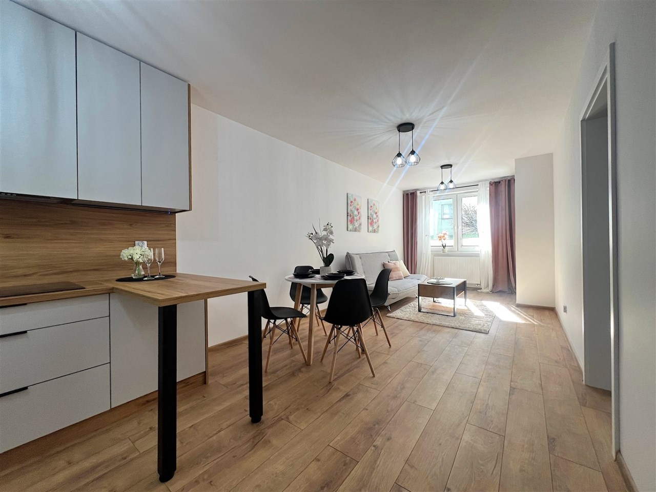 Mieszkanie składa się z przestronnego salonu z wyjściem na taras. Strefa dzienna została wyposażona w wygodną sofę oraz stolik kawowy, tworząc komfortową przestrzeń do odpoczynku. Bezpośrednie wyjście na taras pozwala cieszyć się dodatkową przestrzenią rekreacyjną, którą można zaaranżować według własnych potrzeb.