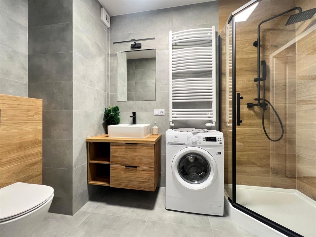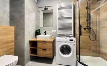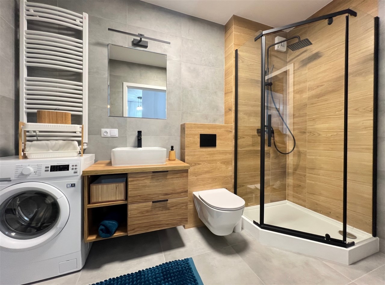 Łazienka urządzona jest w stonowanej, naturalnej kolorystyce i wyposażona w kabinę prysznicową, umywalkę, wc oraz pralkę.