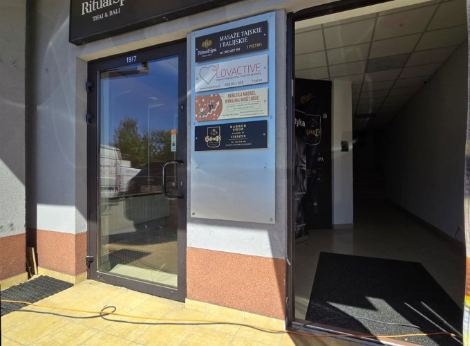 Do lokalu wchodzi się przy głównym wejściu do budynku, a przy wejściu znajduje się przeszklona ściana od strony korytarza, co zapewnia kameralność a jednocześnie możliwość spersonalizowania reklamy.