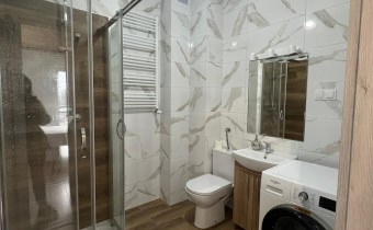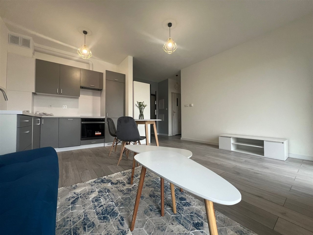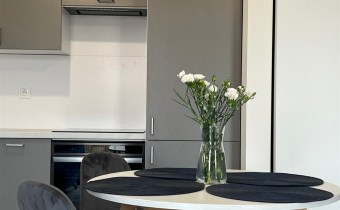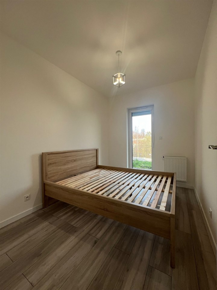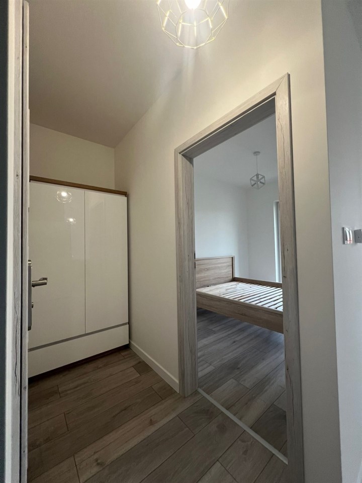 Sypialnia została wyposażona w wygodne łóżko z materacem, a w przedpokoju znajduję się praktyczna szafa, co zwiększa funkcjonalność mieszkania. Całość utrzymana jest w harmonijnej kolorystyce szarości i bieli, która nadaje nowoczesnego charakteru. Kuchnia jest w pełni wyposażona, w łazience znajduje się prysznic, WC, pralka, a dzięki zamontowanym oknom PCV mieszkanie zapewnia ciszę i komfort.