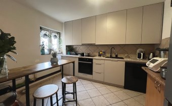Kuchnia została nowo wyremontowana i jest wyposażona w meble kuchenne. Na podłodze znajdują się kafelki oraz płytki ceramiczne na ścianie między blatem a górnymi szafkami.
