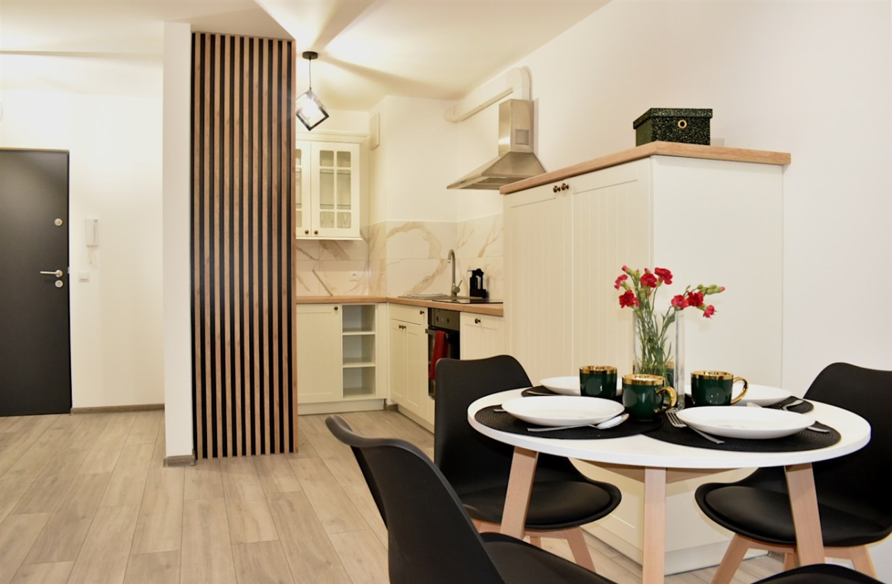 - Otwarta, wyposażona kuchnia (lodówka, zmywarka, płyta grzewcza, piekarnik) z jadalnią, w której znajduje się stół z czteroma krzesłami, idealne do wspólnych posiłków.