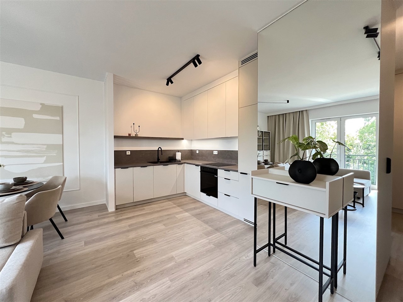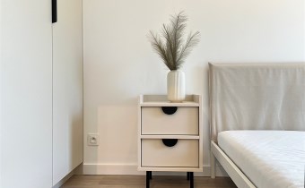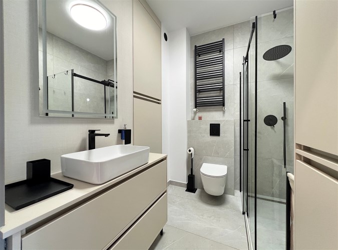 Apartament został wykończony w wysokim standardzie według projektu, gdzie zostały wyznaczone strefy korzystania tj. cześć wypoczynkowa czy jadalnia, dzięki czemu funkcjonalność mieszkania jest na najwyższym poziomie. We wszystkich pomieszczeniach zarówno w sypialniach jak i łazience wykonano zabudowy pod wymiar, wszystko w stonowanej, spójnej kolorystyce.