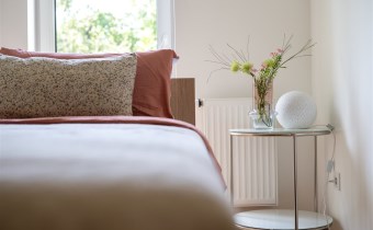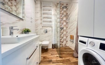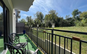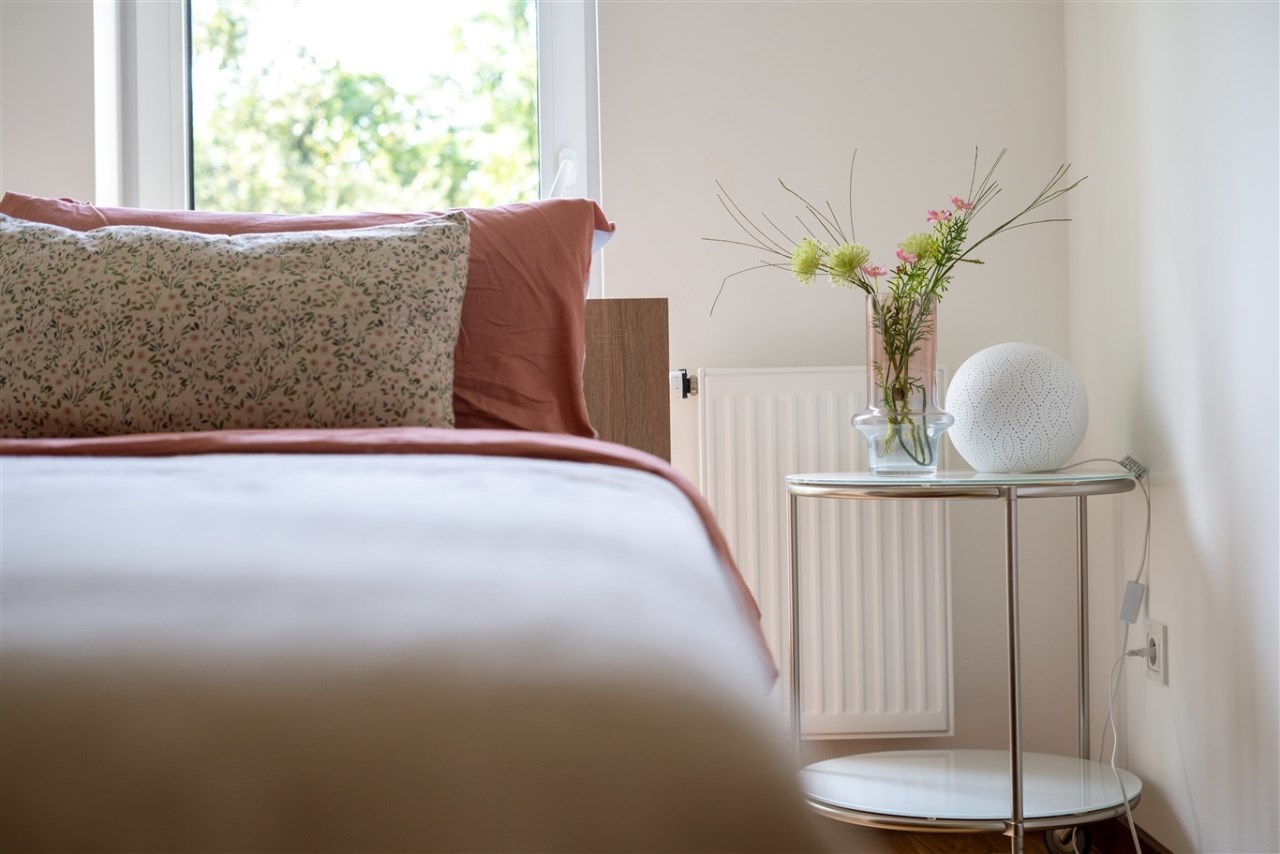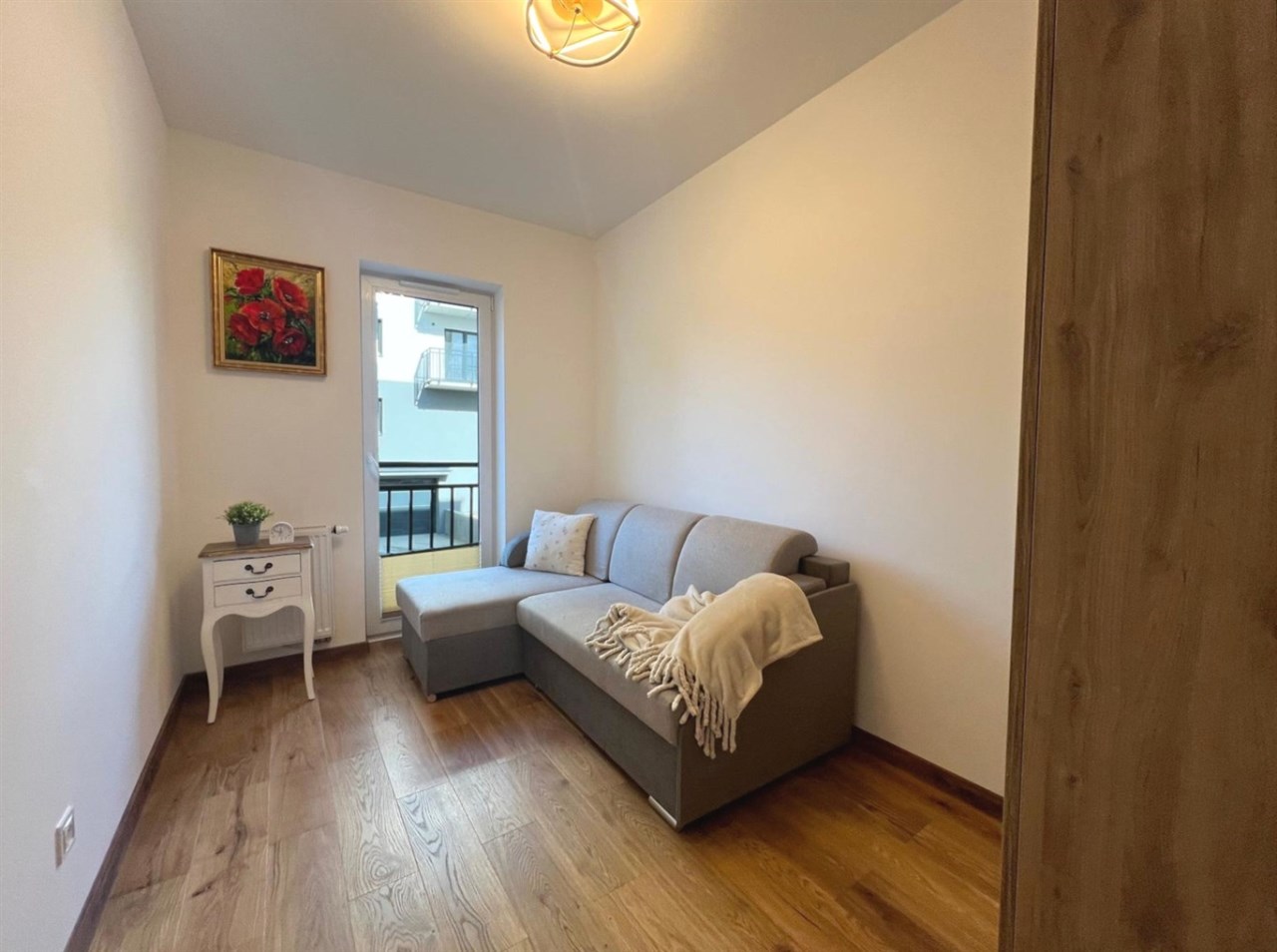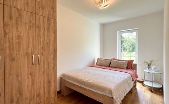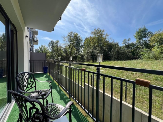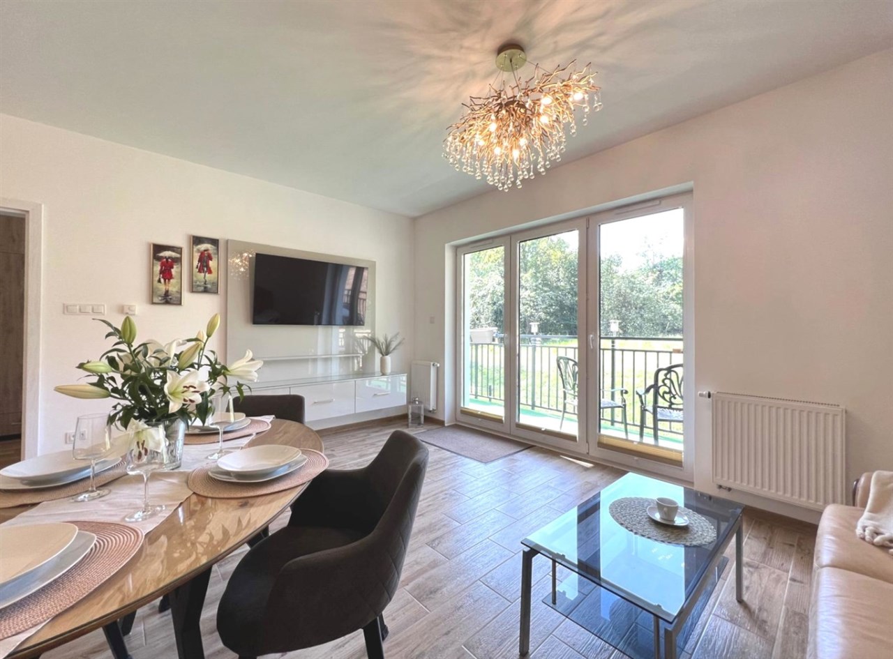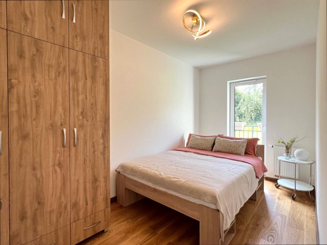 Mieszkanie składa się z przestronnego salonu z aneksem kuchennym, dwóch oddzielnych sypialni, łazienki z WC oraz przedpokoju. Z salonu jest wyjście na duży balkon z widokiem na zieleń i sad, co zapewnia ciszę oraz prywatność. Zimą w pobliskim sadzie często można zaobserwować sarny, co dodatkowo podkreśla spokojny, naturalny charakter okolicy.