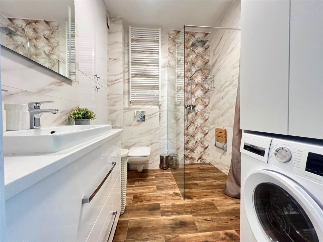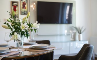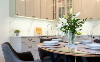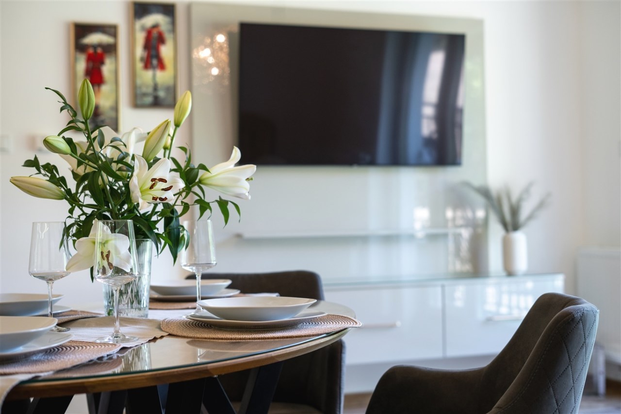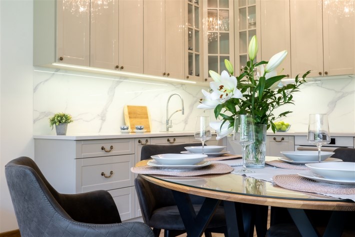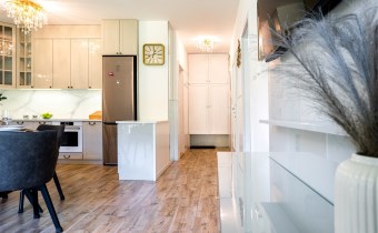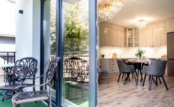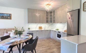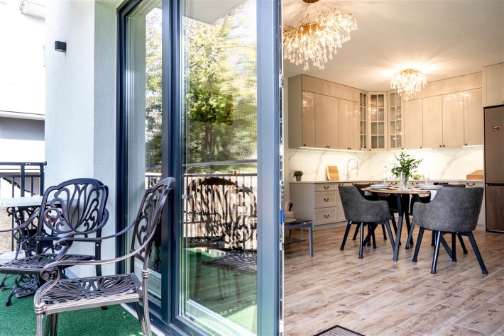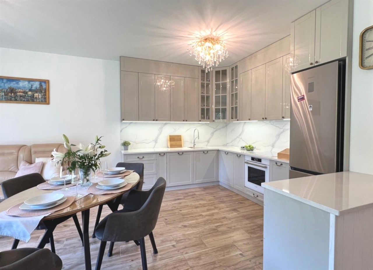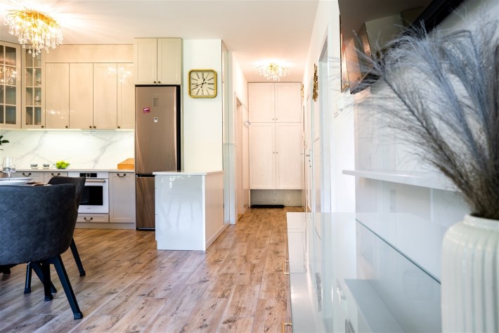 Mieszkanie jest w pełni umeblowane i gotowe do zamieszkania. Wnętrze zostało zaprojektowane i wykończone z najwyższą starannością, z dbałością o każdy szczegół. W salonie znajduje się część wypoczynkowa z kanapą, zabudowa RTV z telewizorem, stół z krzesłami oraz gustowne najwyższej jakoś lampy nadające mieszkaniu niezwykły klimat. Kuchnia została wykonana z wysokiej jakości materiałów, wyposażona w sprzęt AGD oraz funkcjonalne rozwiązania do przechowywania, takie jak organizery w szafkach, które pozostają na wyposażeniu mieszkania.