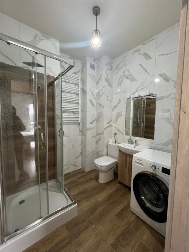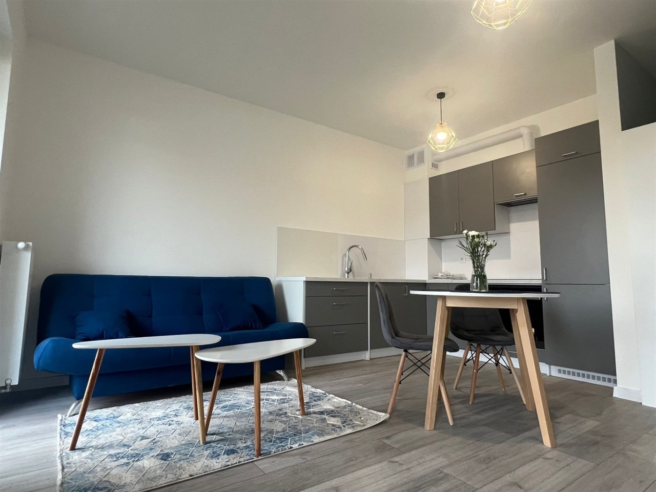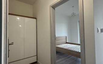 Sypialnia została wyposażona w wygodne łóżko z materacem, a w przedpokoju znajduję się praktyczna szafa, co zwiększa funkcjonalność mieszkania. Całość utrzymana jest w harmonijnej kolorystyce szarości i bieli, która nadaje nowoczesnego charakteru. Kuchnia jest w pełni wyposażona, w łazience znajduje się prysznic, WC, pralka, a dzięki zamontowanym oknom PCV mieszkanie zapewnia ciszę i komfort.