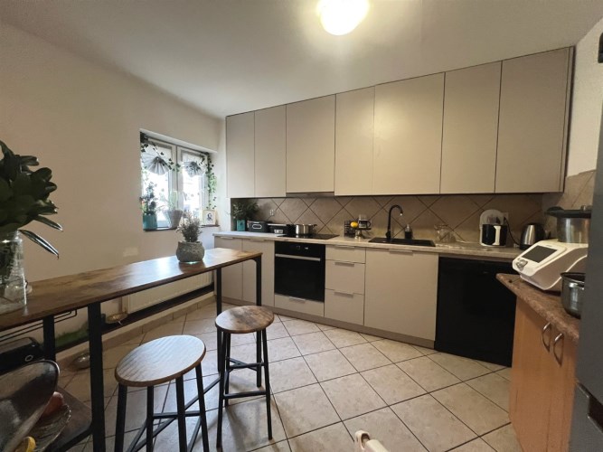Kuchnia została nowo wyremontowana i jest wyposażona w meble kuchenne. Na podłodze znajdują się kafelki oraz płytki ceramiczne na ścianie między blatem a górnymi szafkami.