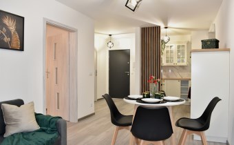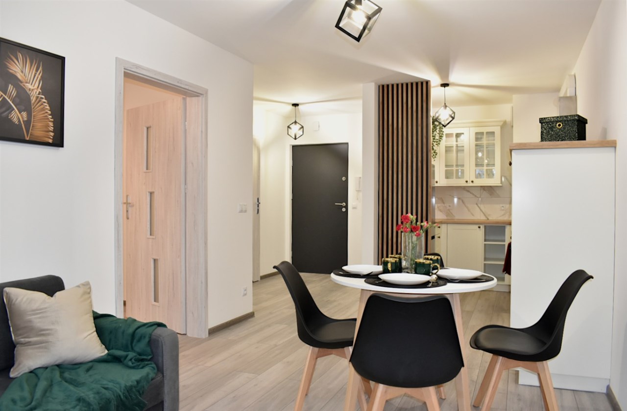 - Otwarta, wyposażona kuchnia (lodówka, zmywarka, płyta grzewcza, piekarnik) z jadalnią, w której znajduje się stół z czteroma krzesłami, idealne do wspólnych posiłków.