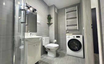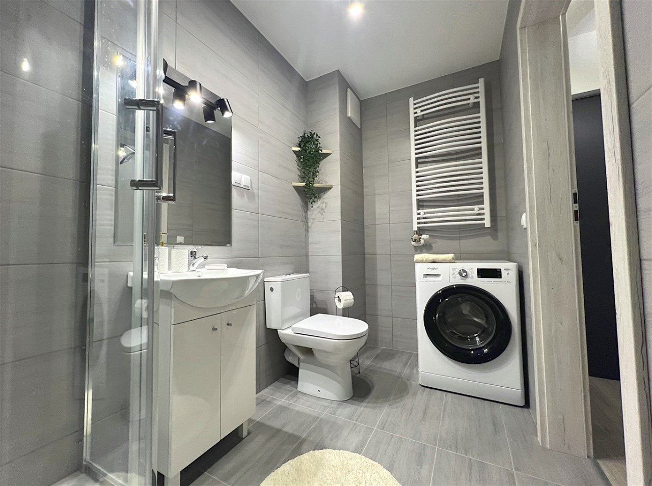 - Łazienka z kabiną prysznicową, umywalką, WC oraz pralką oraz korytarz