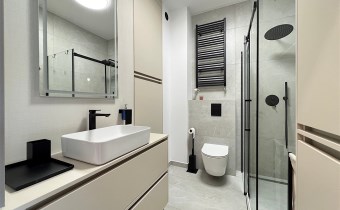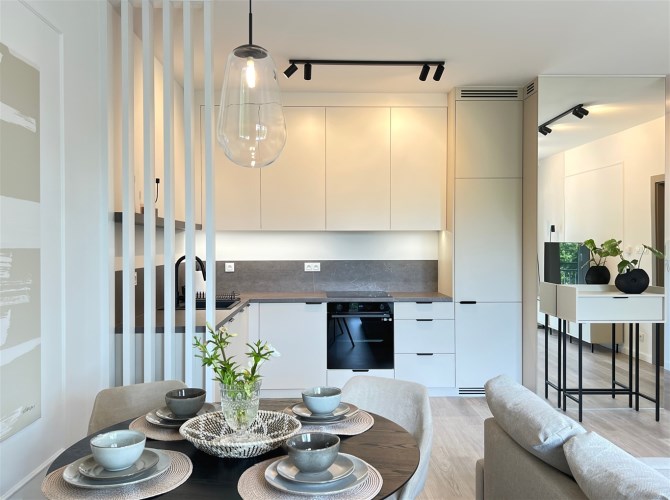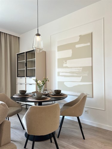 Apartament został wykończony w wysokim standardzie według projektu, gdzie zostały wyznaczone strefy korzystania tj. cześć wypoczynkowa czy jadalnia, dzięki czemu funkcjonalność mieszkania jest na najwyższym poziomie. We wszystkich pomieszczeniach zarówno w sypialniach jak i łazience wykonano zabudowy pod wymiar, wszystko w stonowanej, spójnej kolorystyce.